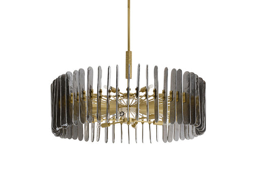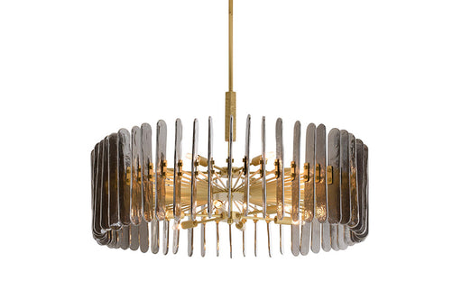 Arteriors HomeOriginal price $5,185.00 - Original price $5,185.00Original price$5,185.00$5,185.00 - $5,185.00Current price $5,185.00| /Seedy slump glass panels in a smoke luster finish are fastened to an antique brass-plated iron frame, creating a drum-shaped shade. This glimmeri...