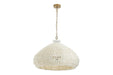 The Lilo combines a classic shape with unique natural materials. The shallow but wide bell-shaped silhouette of the shade is constructed of varied white wooden beads neatly housing three bulbs, and suspended by an antique brass iron chain. Rustic yet modern, the unique, low-profile construction delivers tons of texture. A wide disc-shaped finial tops the shade as a matching textural accent. Finish will vary. Additional chain available (CHN-247).