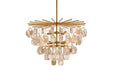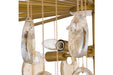 Round amber seedy glass drops are suspended in a cascading wind chime-inspired silhouette from an armature of antique brass-plated steel. Inspired by a handbag, each glass shape is supported by a delicate, yet sturdy chain threaded through its "handle," allowing the drops to refract the light for a dazzling effect. Certified for damp locations and intended for interior use. Finish will vary.