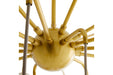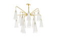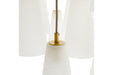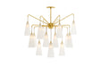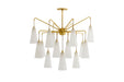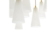 The Mika reveals a bold design of modern lines and sophisticated materials. A staggered silhouette of antique brass steel arms spiders out to showcase 18 opal swirl glass shades in a matte finish. The stepped frame is dramatic in scale and features shades at various height drops for an impressive lightscape. Complete with a taupe cloth cord. Additional pipe available (PIPE-422). Certified for damp locations and intended for interior use.