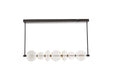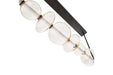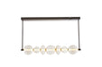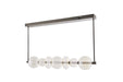 The Raphael chandelier strikes a refined balance between organic and contemporary design. Totemic shapes of champagne glass are strung like beads along a white acrylic diffuser and anchored to a linear framework constructed of English bronze iron. Integrated LED. Finish will vary. Certified for damp locations and intended for interior use.
