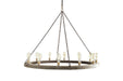Hanging by a purposely rusted chain, this gray wood ring and its 12 lights make a great statement when hanging over a large round dining table or kitchen island. The Edison bulbs in the photo reinforce the rustic, industrial feel. Additional chain available CHN-987. Certified for damp locations and intended for interior use.