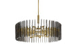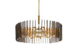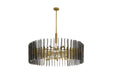 Seedy slump glass panels in a smoke luster finish are fastened to an antique brass-plated iron frame, creating a drum-shaped shade. This glimmering style is supersized on a new, impactful scale. It is made to illuminate larger spaces, as the soft sheen from the light further enhances the moody quality and spotlights its radial composition. The chattered detail and undulating shape of the panels work in tandem, delivering visual texture. Certified for damp locations and intended for interior use. Finish will vary.